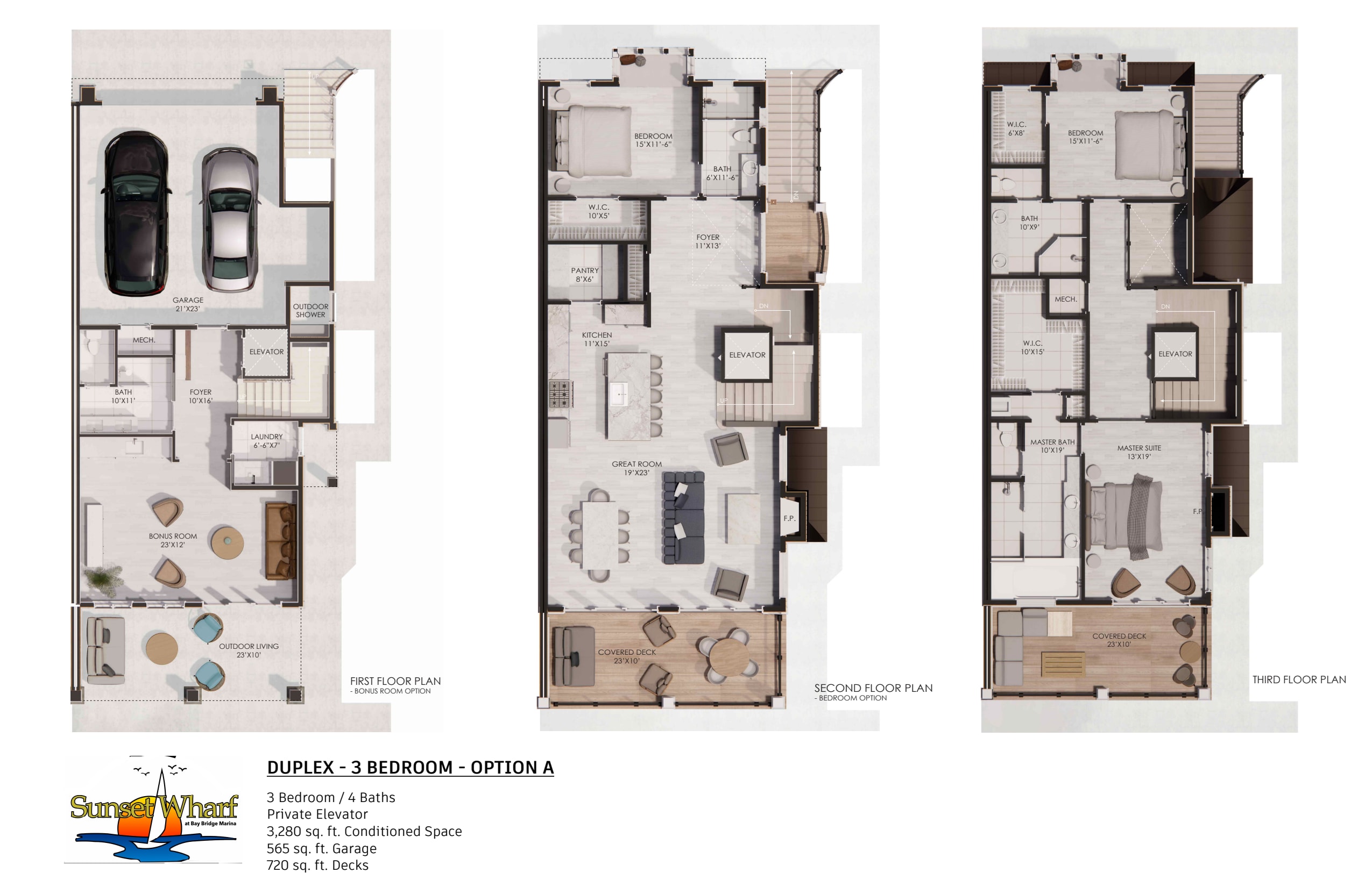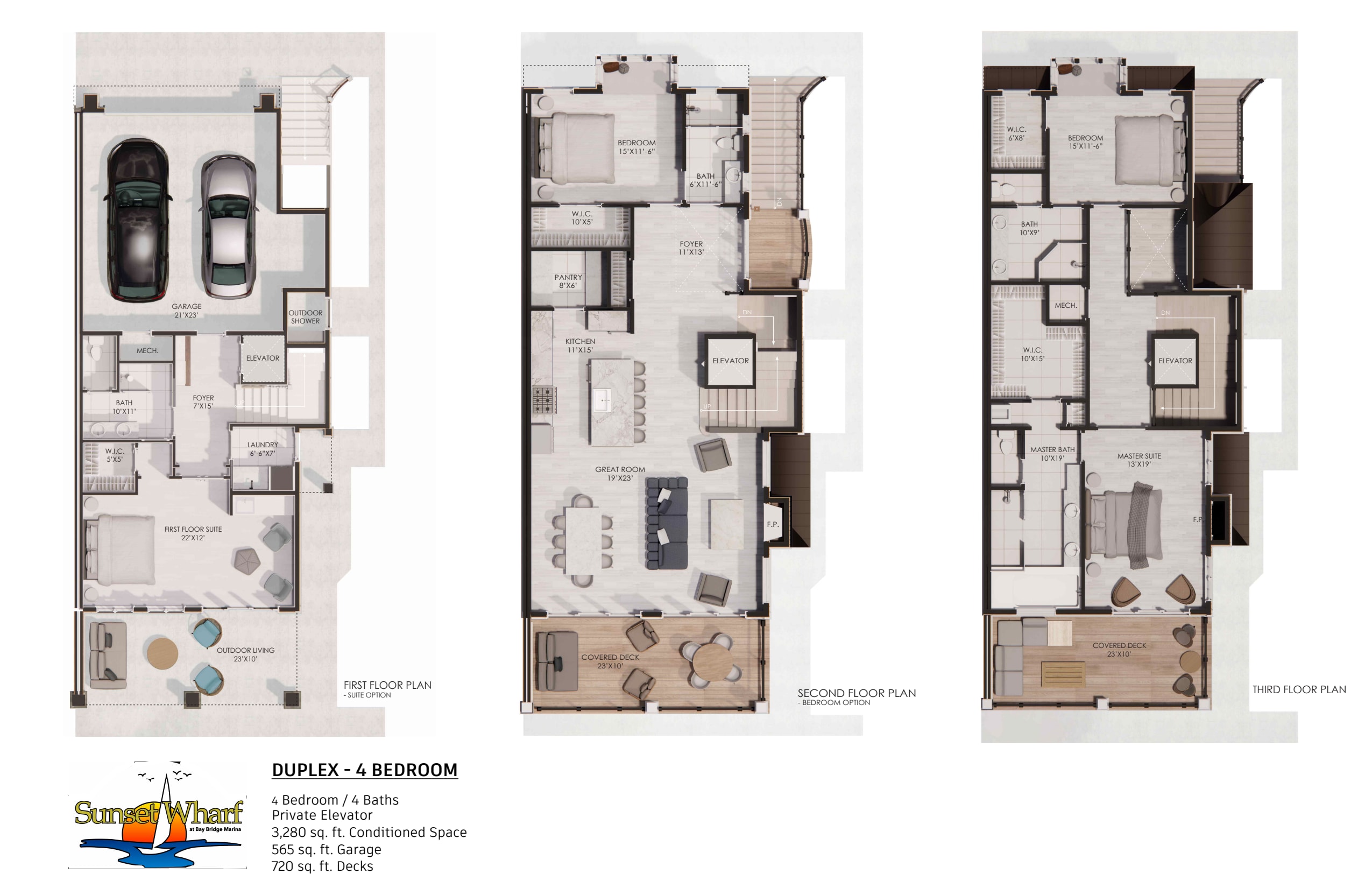 Experience thoughtful design and modern living with the floor plans at Sunset Wharf. Each duplex offers an open-concept layout, seamlessly connecting living, dining, and kitchen areas for a spacious and airy feel. Enjoy the luxury of expansive windows that flood your home with natural light and provide stunning waterside views. Choose from various configurations tailored to your lifestyle, featuring gourmet kitchens, ample storage, and private outdoor spaces perfect for relaxation and entertainment. The master suites serve as a serene retreat, complete with walk-in closets and elegant en-suite bathrooms. At Sunset Wharf, every detail is designed to enhance your living experience, creating a perfect balance of comfort and sophistication.